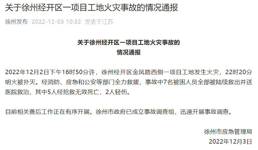 2022年12月2日下午16時(shí)50分左右,徐州經(jīng)濟(jì)技術(shù)開(kāi)發(fā)區(qū)金鳳路西側(cè)一項(xiàng)目工地發(fā)生火災(zāi),過(guò)火面積約700平方米,導(dǎo)致5人死亡、2人受傷。建設(shè)單位是金*新材料(徐州)有限公司,施工單位是中*系統(tǒng)建設(shè)工程有限公司,監(jiān)理單位是青島市**建設(shè)監(jiān)理有限責(zé)任公司。事故發(fā)生后,省委、省政府主要領(lǐng)導(dǎo)均作出批示,要求全力組織搜救,救治受傷人員,盡快查明事故原因,舉一反三抓好整改。為切實(shí)加強(qiáng)建筑工地消防安全管理,確保建筑施工領(lǐng)域安全形勢(shì)穩(wěn)定,現(xiàn)就有關(guān)事項(xiàng)通知如下。