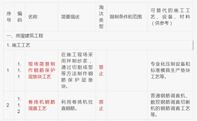 本次擬淘汰目錄里,在房屋建筑工程方面,