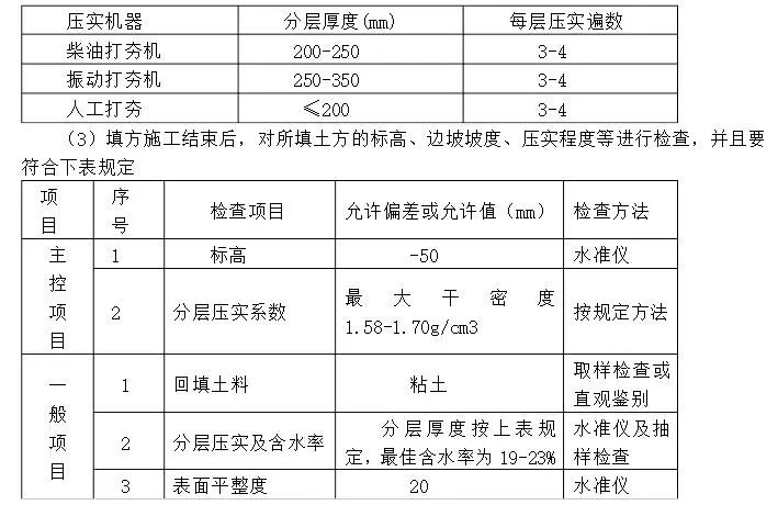 (2)填土施工過程中要檢查排水措施,每層填筑厚度,填方含水量,壓實(shí)程度。填筑厚度及壓實(shí)遍數(shù)可根據(jù)土質(zhì),壓實(shí)系數(shù)及所用機(jī)器確定,由于設(shè)計(jì)無具體要求,可參照下表執(zhí)行。