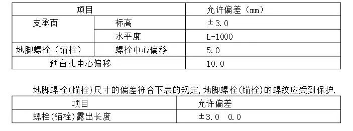 (1)建筑物的定位軸線、基礎(chǔ)軸線和標(biāo)高,地腳螺栓的規(guī)格及其緊固應(yīng)符合設(shè)計(jì)要求。 基礎(chǔ)頂面直接作為柱的支承面和基礎(chǔ)頂面預(yù)埋鋼板或支座作為柱的支承面對(duì)其支承面,地腳螺栓,(錨栓)位置的允許偏差應(yīng)符合本表: