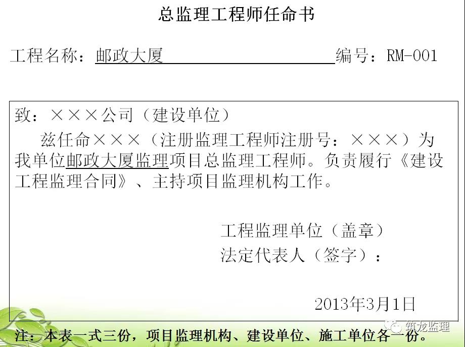 3.《總監(jiān)理工程師任命書》在《建設(shè)工程監(jiān)理合同》簽訂后,由工程監(jiān)理單位法定代表人的簽字,并加蓋單位公章。