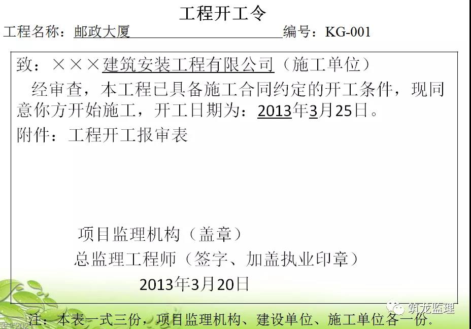 1.建設(shè)單位對《工程開工報審表》簽署同意意見后,總監(jiān)理工程師應(yīng)根據(jù)建設(shè)單位在《工程開工報審表》上的審批意見,簽發(fā)《工程開工令》.2.《工程開工令》中的開工日期作為施工單位計算工期的起始日期.