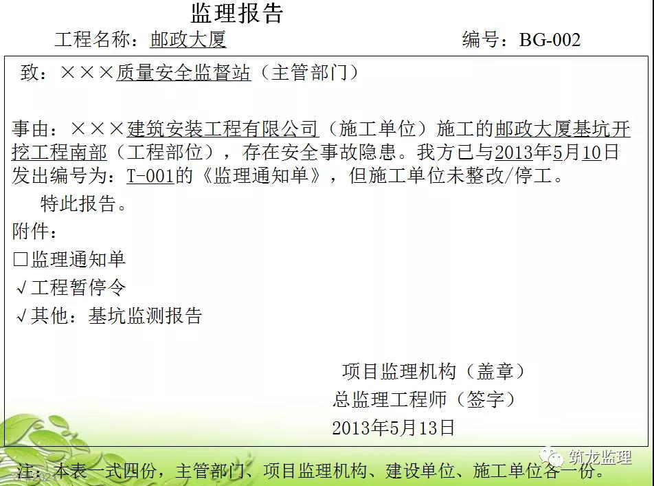 2.緊急情況下,項目監(jiān)理機(jī)構(gòu)通過電話、傳真或電子郵件方式向政府有關(guān)主管部門報告的,事后應(yīng)以書面形式《監(jiān)理報告》送達(dá)政府有關(guān)主管部門,同時抄送建設(shè)單位和工程監(jiān)理單位。