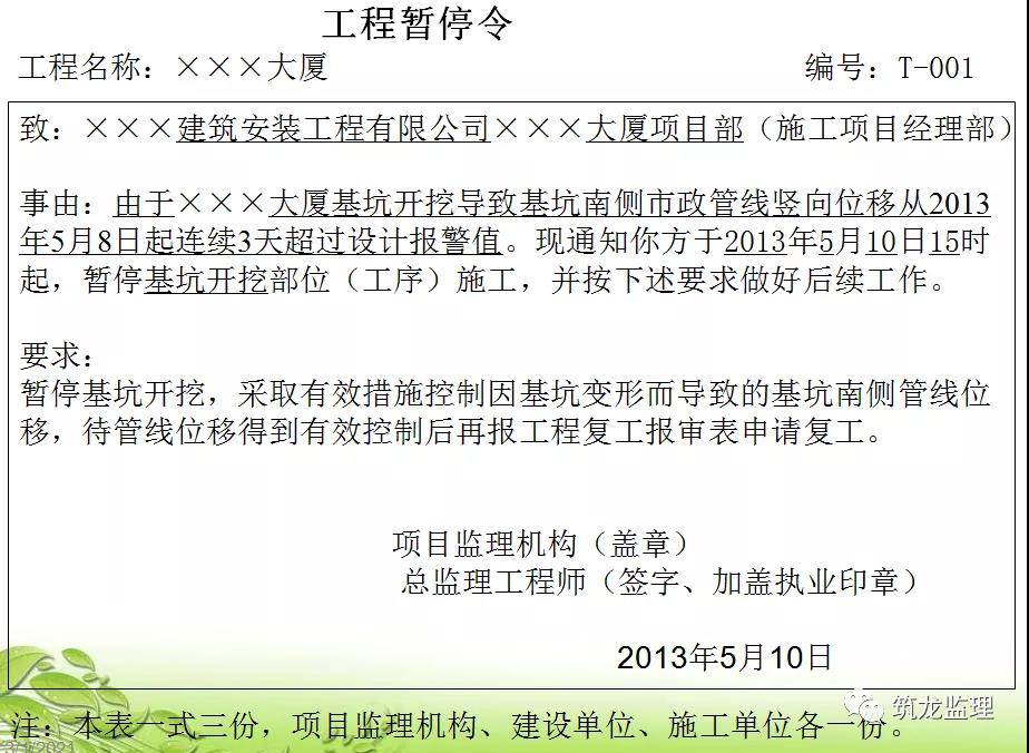 3.簽發(fā)工程暫停令時,應(yīng)注明停工原因、停工部位、停工范圍及停工時間等。