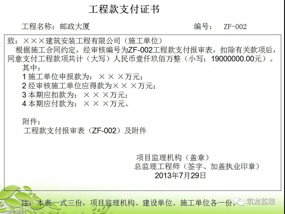 4.項目監(jiān)理機(jī)構(gòu)將《工程款支付證書》簽發(fā)給施工單位時,應(yīng)同時抄報建設(shè)單位,并注意自己存留或記載。