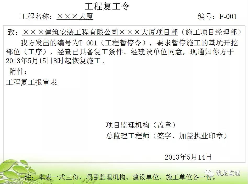 必須注明復(fù)工的部位和范圍、復(fù)工日期等,并附《工程復(fù)工報審表》等其他相關(guān)說明文件。