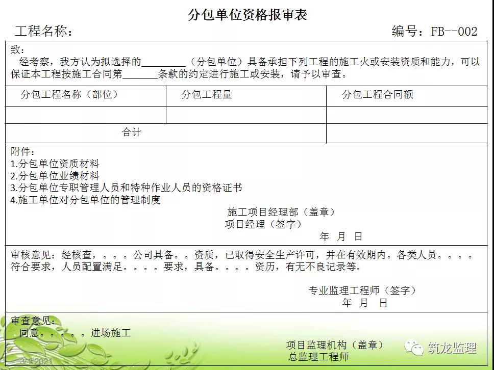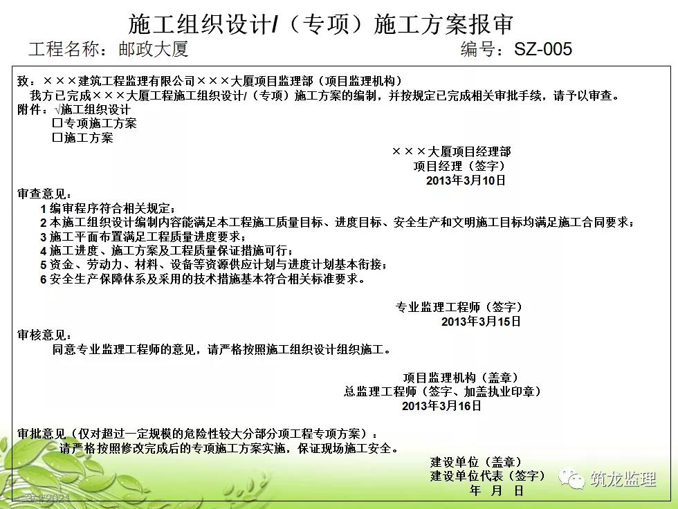 適用范圍:用于施工組織設(shè)計或(專項)施工方案報審及施工組織設(shè)計(方案)發(fā)生改變后的重新報,對危及機(jī)構(gòu)安全或使用功能的分項工程整改方案的報審及重點部位、關(guān)鍵工序的施工工藝、四新技術(shù)的工藝方法和確保工程質(zhì)量的措施的報審。