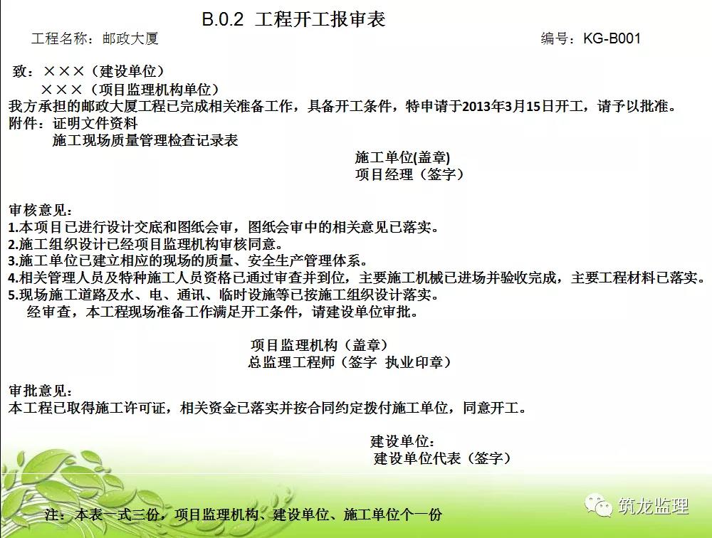 1.基本表式分A、B、C三類。A類表為工程監(jiān)理單位用表,由工程監(jiān)理單位或項目監(jiān)理機(jī)構(gòu)簽發(fā);B類表為施工單位報審、報驗用表,由施工單位或施工項目經(jīng)理部填寫后報送工程建設(shè)相關(guān)方;C類表為通用表,是工程建設(shè)相關(guān)方工作聯(lián)系的通用表.