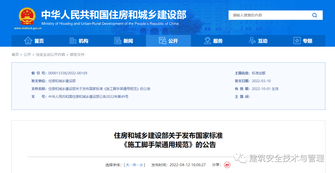 關(guān)于發(fā)布國家標(biāo)準(zhǔn)《施工腳手架通用規(guī)范》的公告